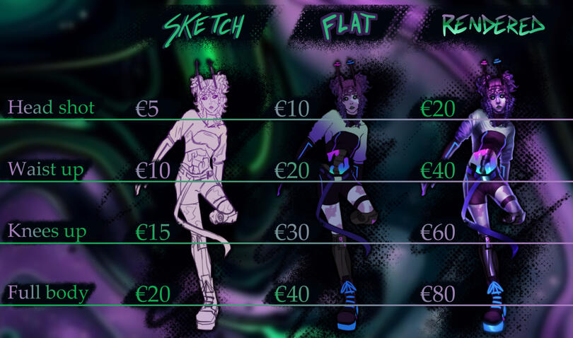 Upon payment you agree to uphold the following terms. I have the right to turn down a request if I feel it’s not suited for my style or if I feel uncomfortable creating something. I can do small revisions on wips, [e.g. changing colours, expression, etc] for free. If the revision is drastic [e.g. changing pose, whole outfit, etc] i will add a fee. Please have a clear idea of the finished piece to avoid this.PAYMENT METHODS